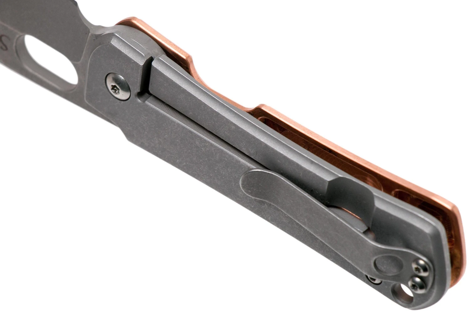 Le Böker Plus Gust Copper 01BO146 est un couteau de poche artistique conçu par Serge Panchenko. Les connaisseurs des designs de Serge reconnaitront immédiatement son travail. Ses couteaux ont souvent une apparence très ‘’vintage’’. Böker produit ce couteau avec une finition stonewashed sur le manche ainsi que sur la lame en acier D2. Vous ouvrez le Böker Plus Gust avec le trou pour le pouce pour ensuite voir le framelock bloquer la lame. Le clip de poche permet de transporter le couteau en toute facilité.